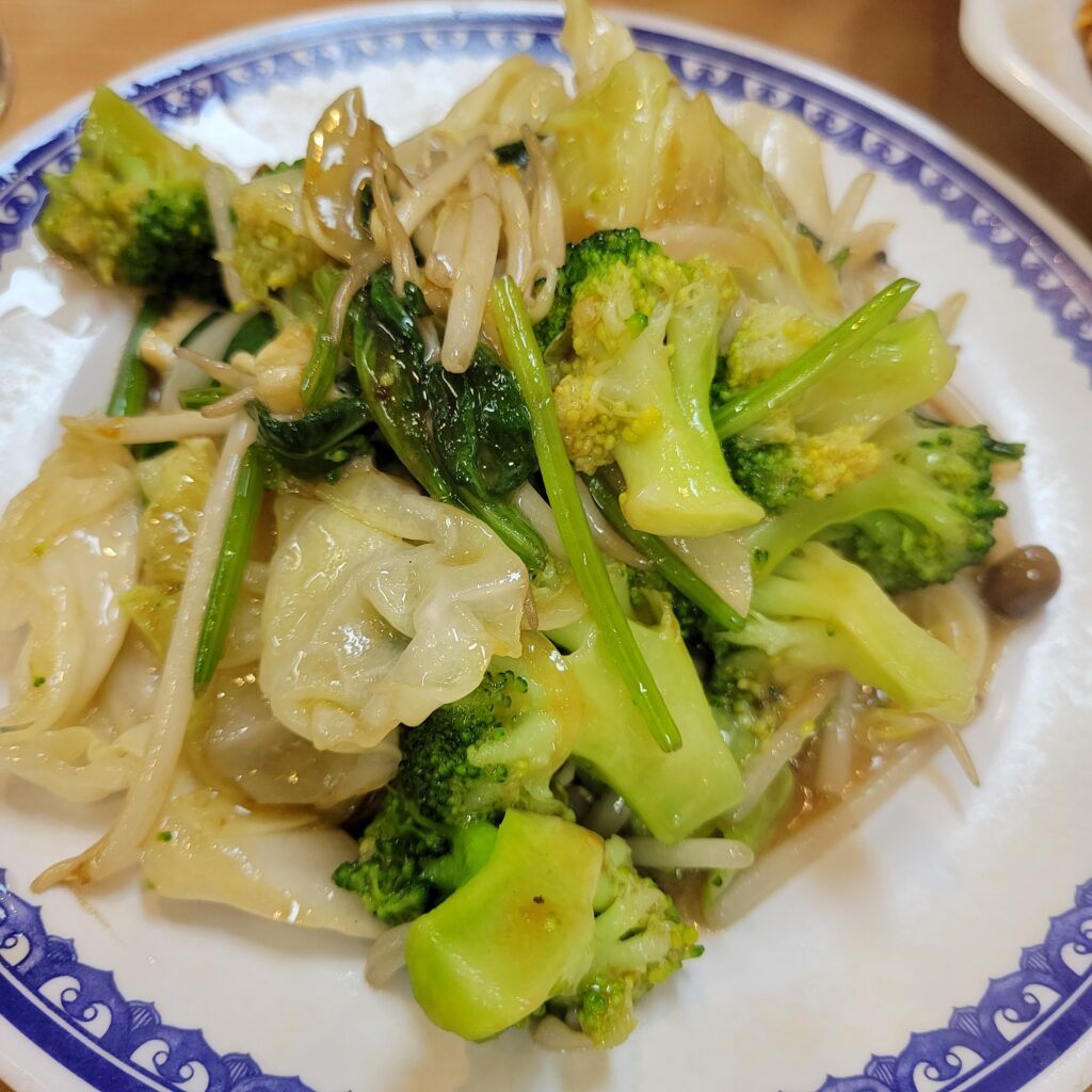 野菜炒めは、あっさり味で素材の旨みがしっかり感じられました。揚げギョーザの濃厚さと野菜炒めのさっぱり感が絶妙なコンビネーションです。