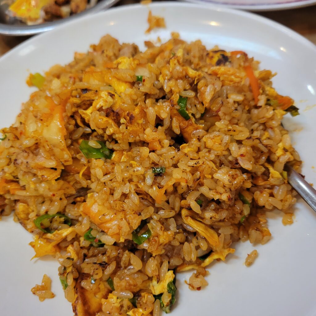 締めはキムチチャーハンで。ピリ辛のキムチがご飯にしっかり絡んでいて、ほどよい辛さと旨みがクセになる味わいでした。最後まで飽きずに楽しめる一品です。