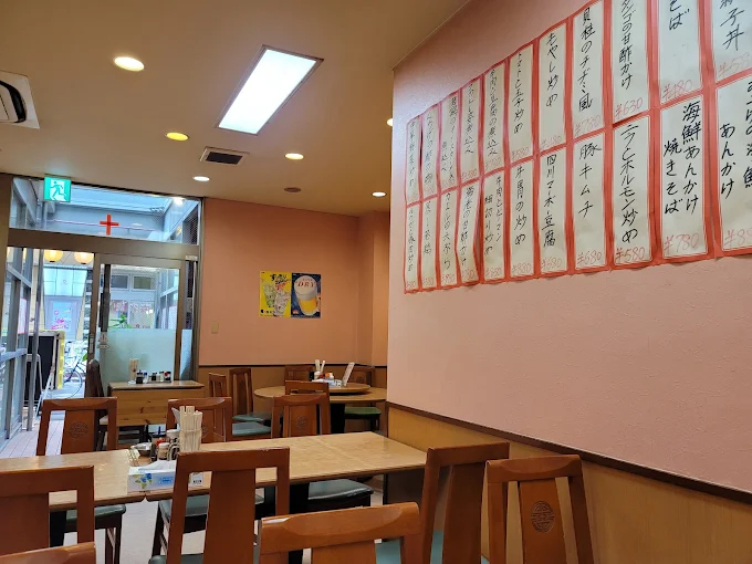店内は昔ながらの中華食堂そのもの。赤い提灯や木の椅子、ラーメン屋さん風のカウンター席が、どこか懐かしい昭和の空気を感じさせます。お一人様や家族連れ、友人同士も気兼ねなく訪れやすい、どなたにも優しい雰囲気です。