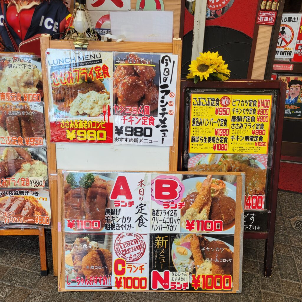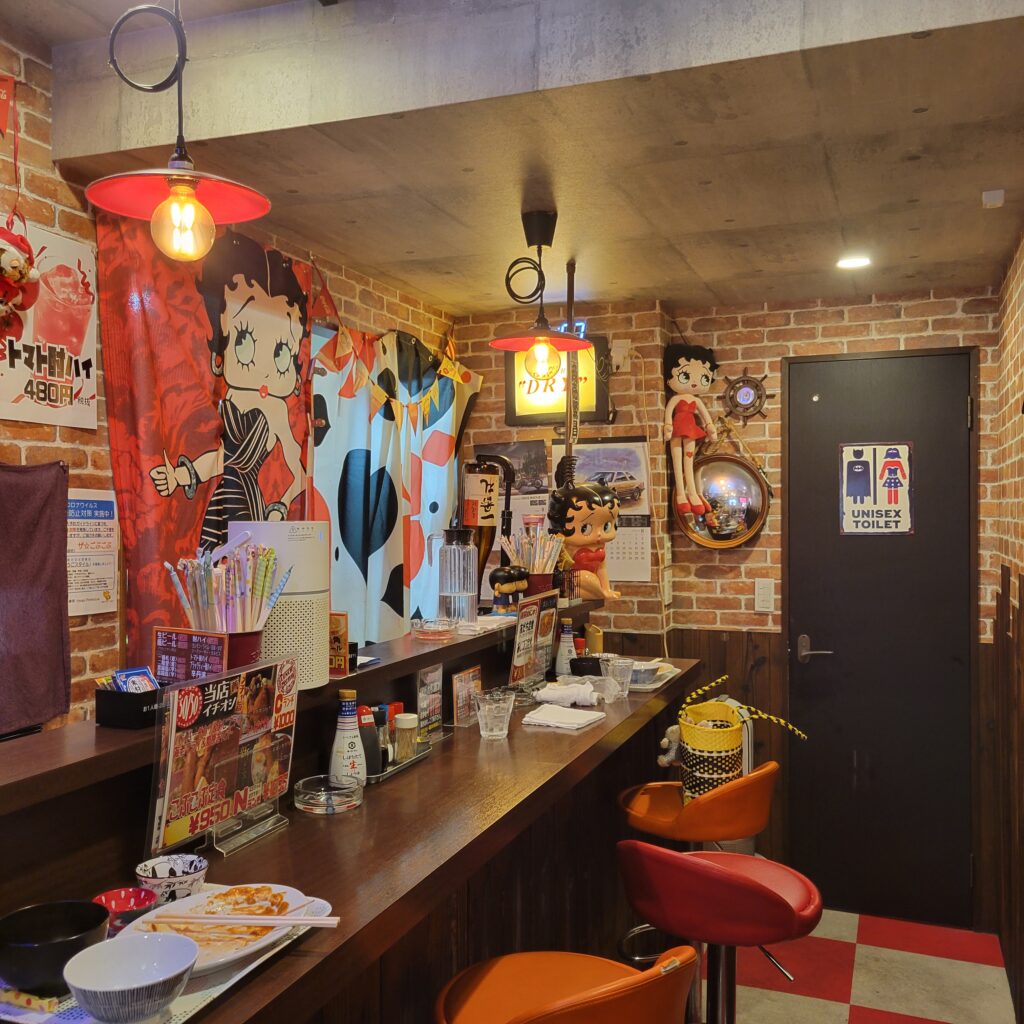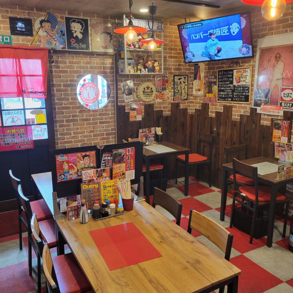 店内に入ると、まず目に飛び込んでくるのは赤を基調にした内装。壁にはベティちゃんのポスターや小物が飾られ、どこかアメリカンな雰囲気を感じつつも、不思議と昭和の洋食店らしさも漂っています。懐かしさとポップさが融合した空間は、どの世代でも居心地よく過ごせるのが魅力です。夜は居酒屋営業もしていて、串カツやおつまみメニューも豊富。お昼と夜で違った楽しみ方ができるのも特徴です。